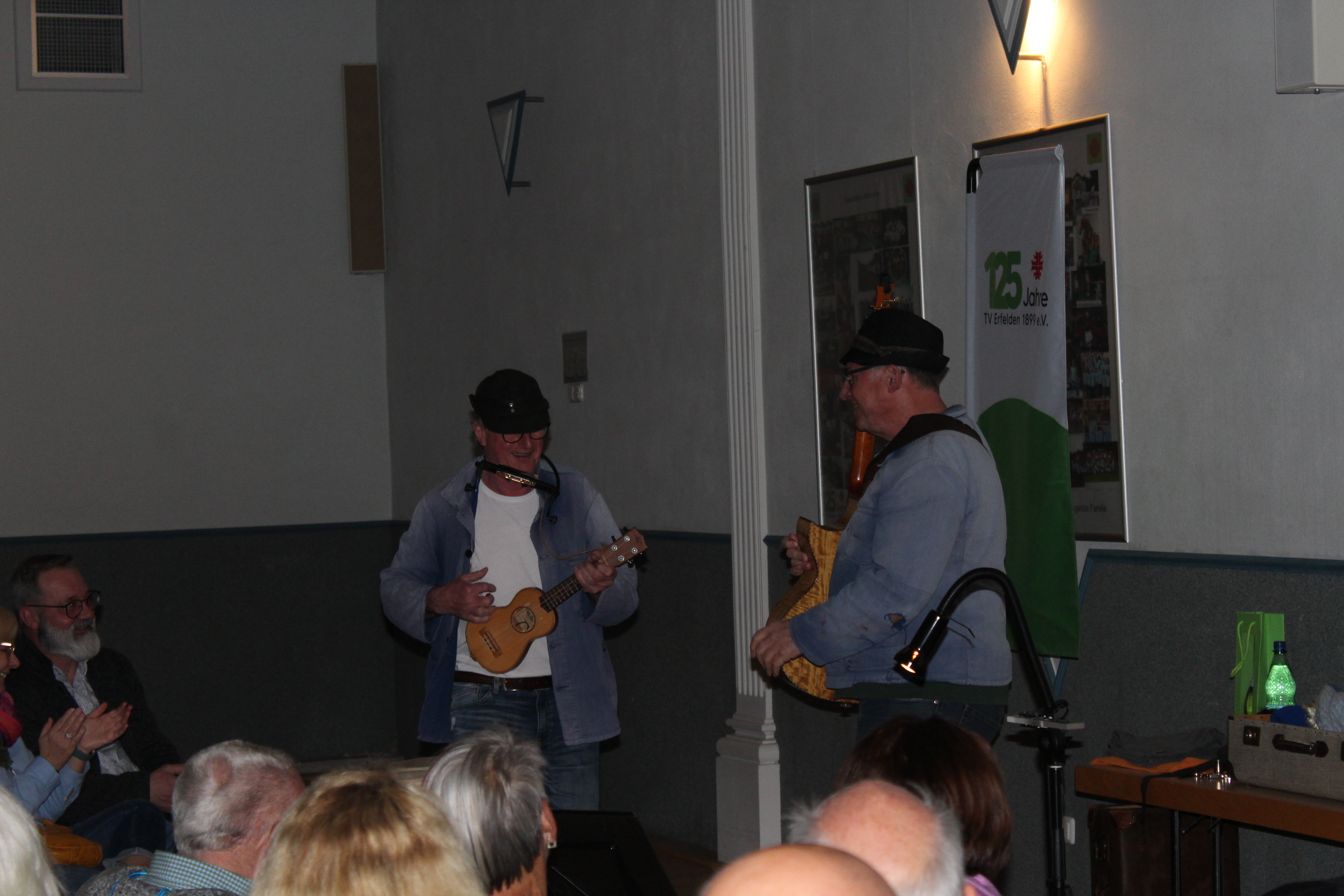 Schon kurz nach Beginn des Vorverkaufs für das Konzert des Kult-Duos „Bees Denäwe“ im Januar war die Kooperationsveranstaltung von städtischem Kulturbüro und TV Erfelden restlos ausverkauft gewesen. Zweieinhalb Monate später hatten die Besucherinnen und Besucher in der vollen Halles des TV Erfelden ihre helle Freude an dem Auftritt von Klaus Lohr und Franz Offenbecher ohne elektrische Verstärkung und ohne Hochdeutsch.