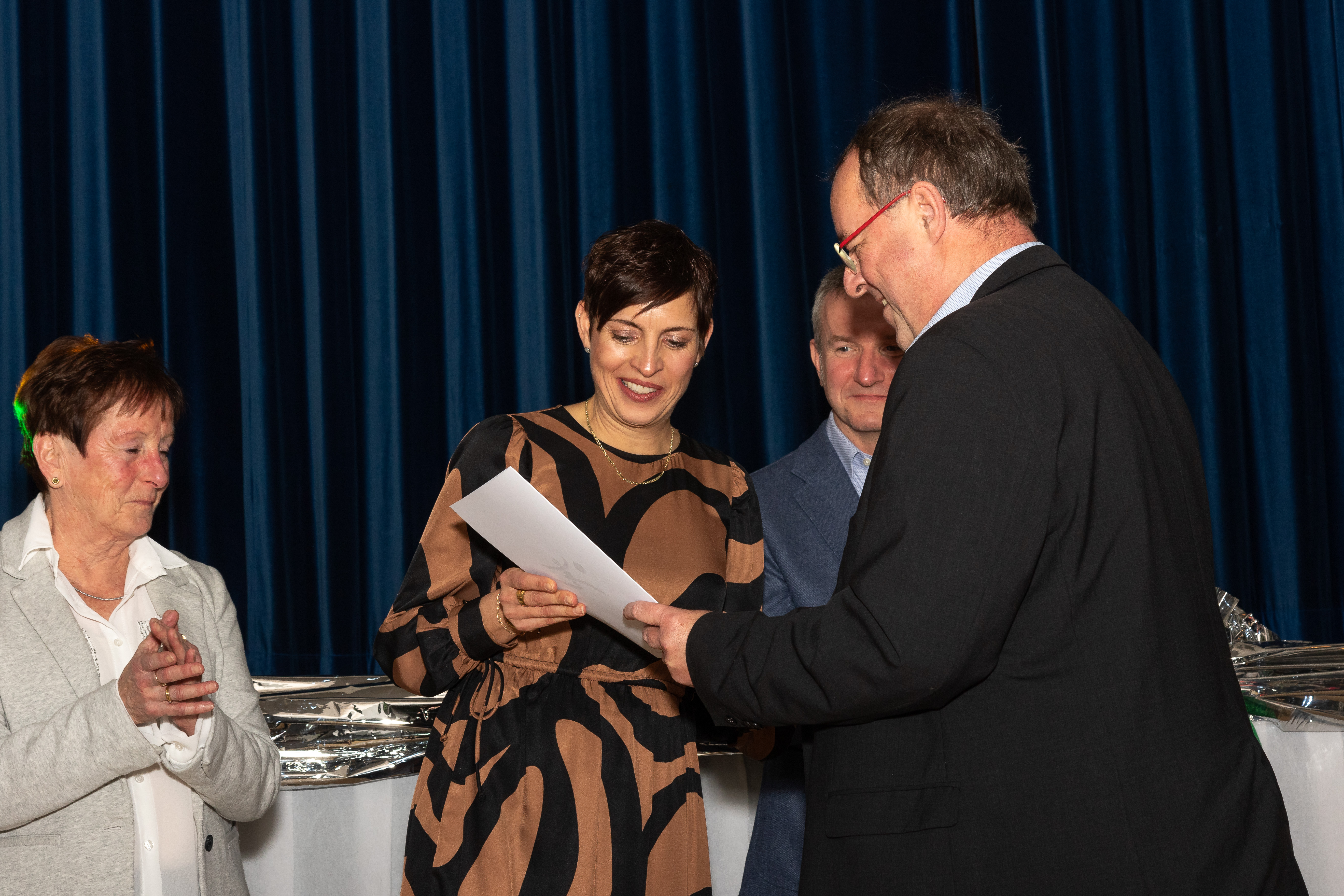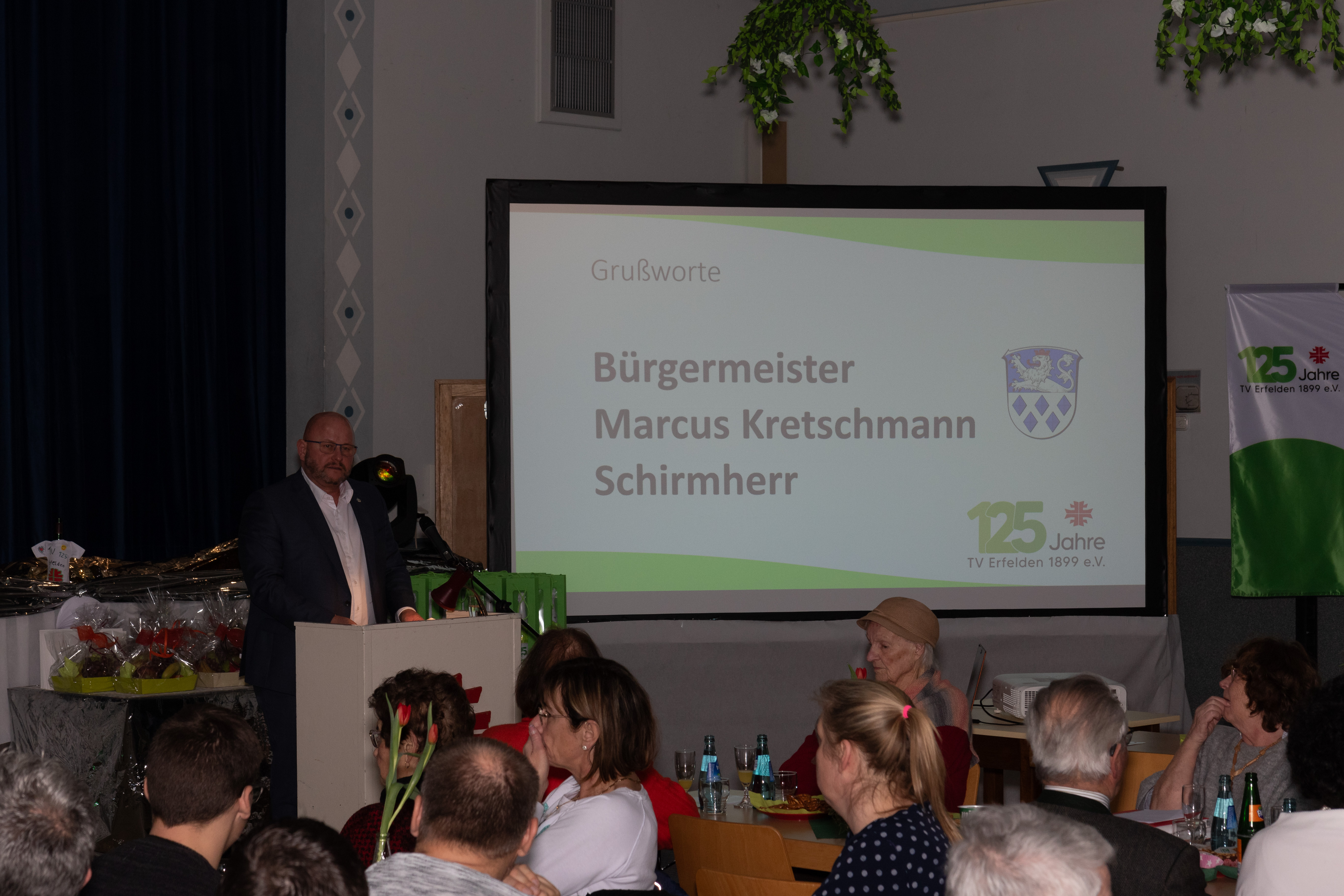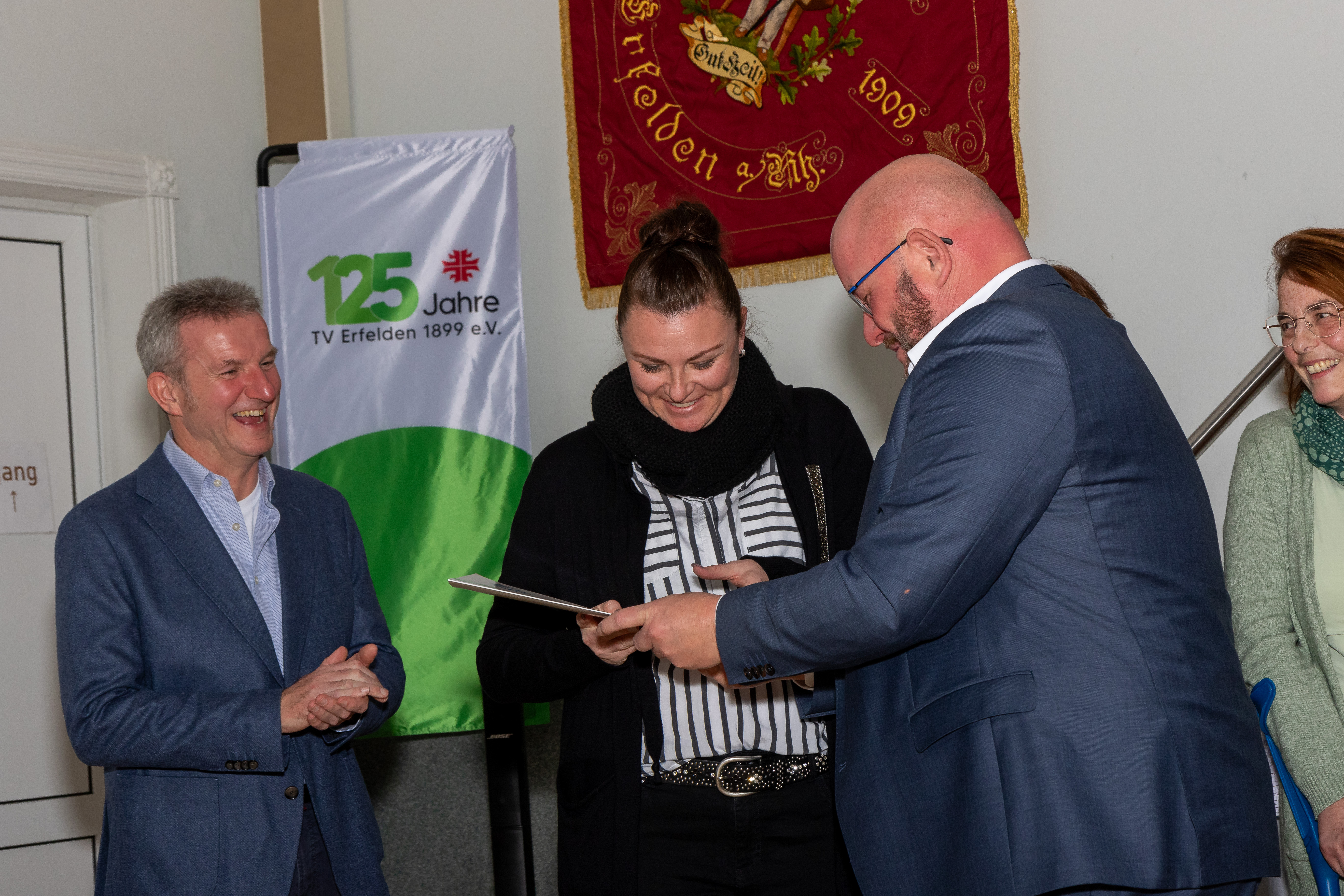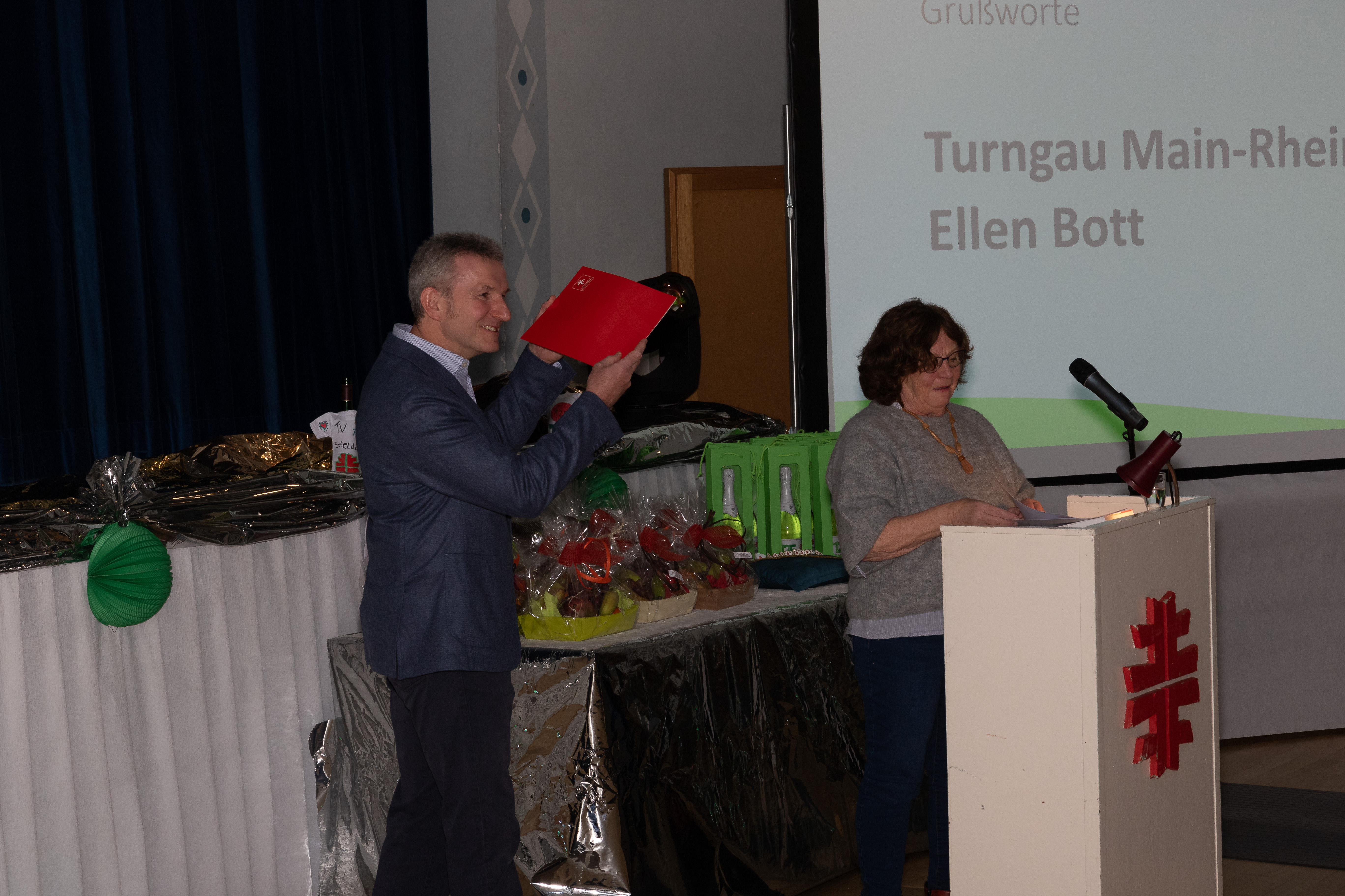 Schirmherr und Bürgermeister Marcus Kretschmann hatte die Ehrenbriefe der Stadt im Gepäck, Ellen Bott vom Turngau Main-Rhein Ehrungen und Gutscheine für unsere Übunsleiter*innen. Auch der Sportkreis Groß-Gerau vertreten durch Udo Ahlheim hatte dem Vereien eine Anerkennung mitgebracht.
