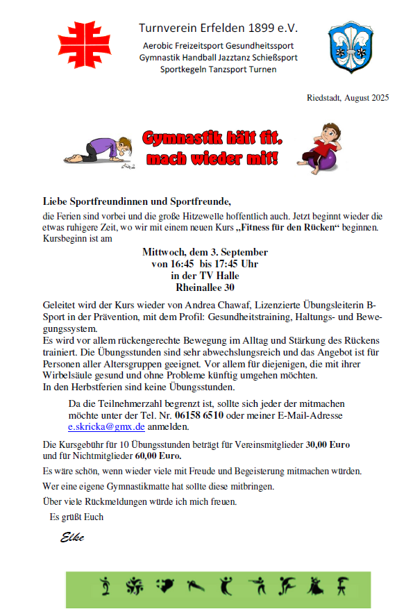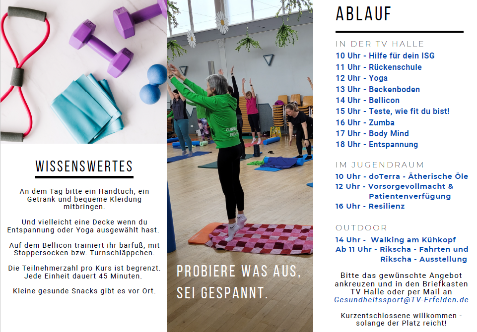 Wie schön, dass du am Gesundheitstag des TV Erfelden teilnehmen möchtest! Bitte trage dich in das jeweilige Angebot ein. Jedes Angebot ist mit der Startzeit zu