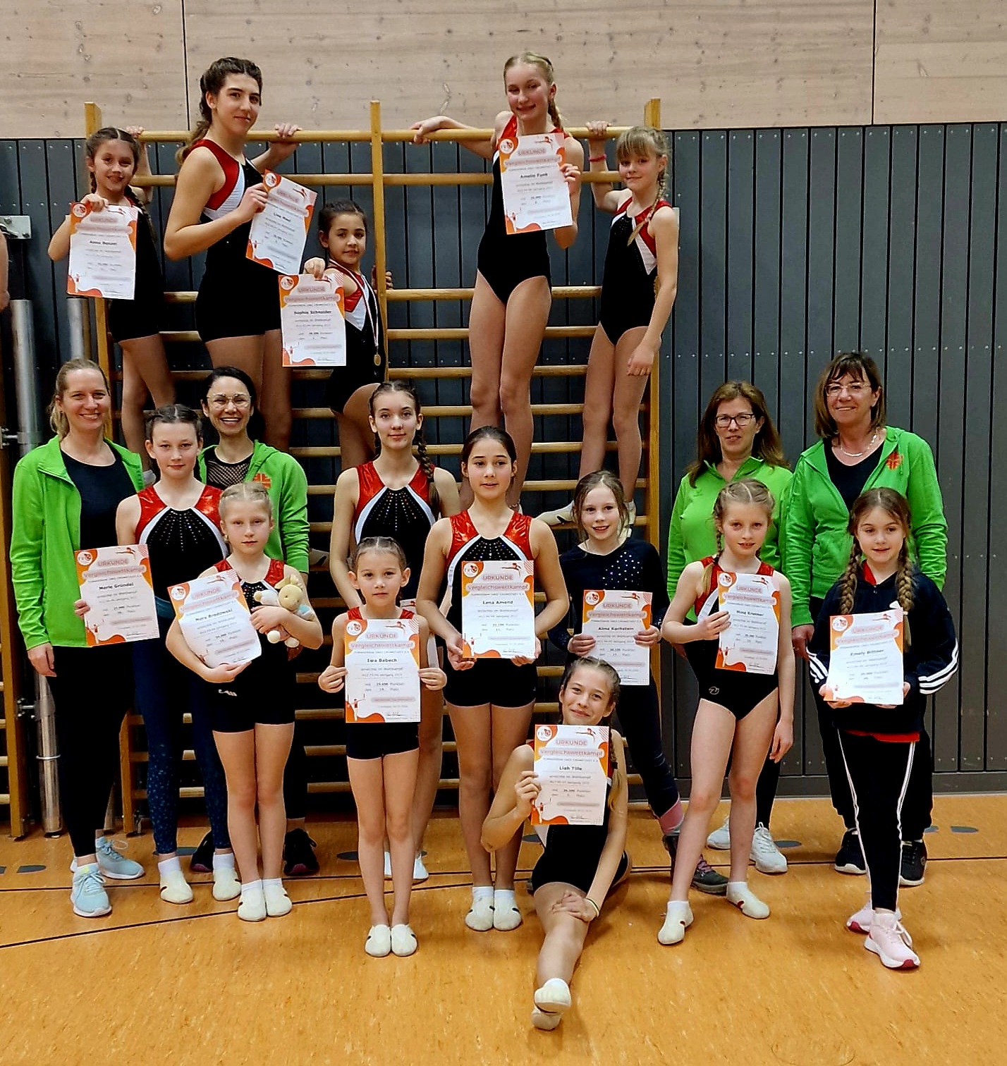 Als die nächste Ehrung Wettkampf M12 vorgelesen wurde stieg die Spannung erneut: Sophie Schneider im Jahrgang 2015, konnte bei 20 Turnerinnen Gold für den TV Erfelden holen! Wir sind stolz auf die Leistungen aller Turnerinnen und wie gut sie unseren Verein im Jubiläumsjahr vertreten haben. Herzlichen Dank auch an die mitfiebernden Eltern und besonders unsere vier Betreuerinnen Daniela, Christine, Jasmin und Daniela, sowie Lina, die als Kampfrichterin aktiv war.