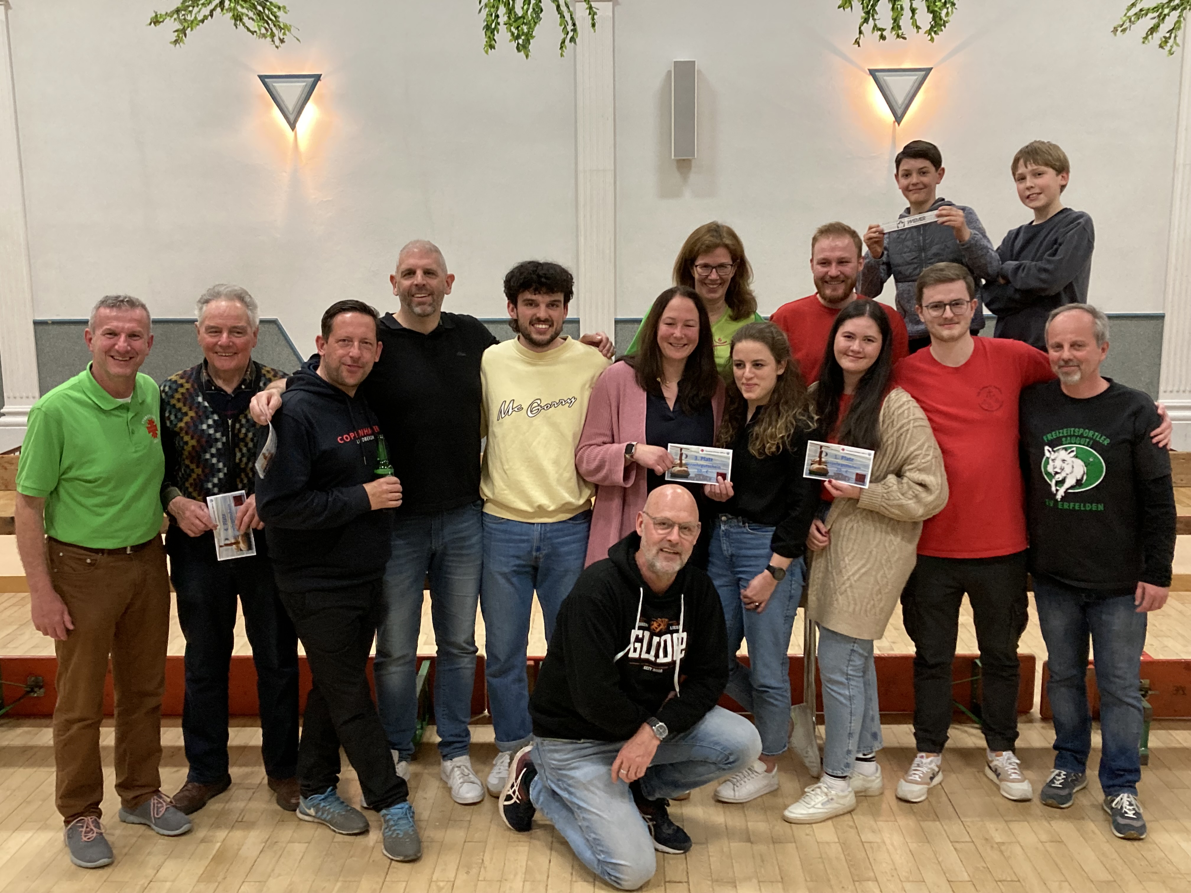 15 Mannschaften mit jeweils 3 Teilnehmern haben ab 18:00 Uhr ihre ersten Punkte beim Bosseln eingespielt. Gespielt wurde auf 2 Bahnen. Gestartete wurde in 4 Gruppen mit je 4 Mannschaften. Die beiden ersten der Gruppe spielten dann die Halbfinalpartien aus. Im Spiel um den dritten Platz setzen sich die Rohrem/Erwelle Connection gegen die Rhoischnooge durch. Das Finale endete gegen 21:30 Uhr. Platz zwei belegte die Mannschaft „Trink aus und spielt“. Gewonnen hat das Finale das Team „Bosselbande“ mit Lisa, Benedikt und Noah.