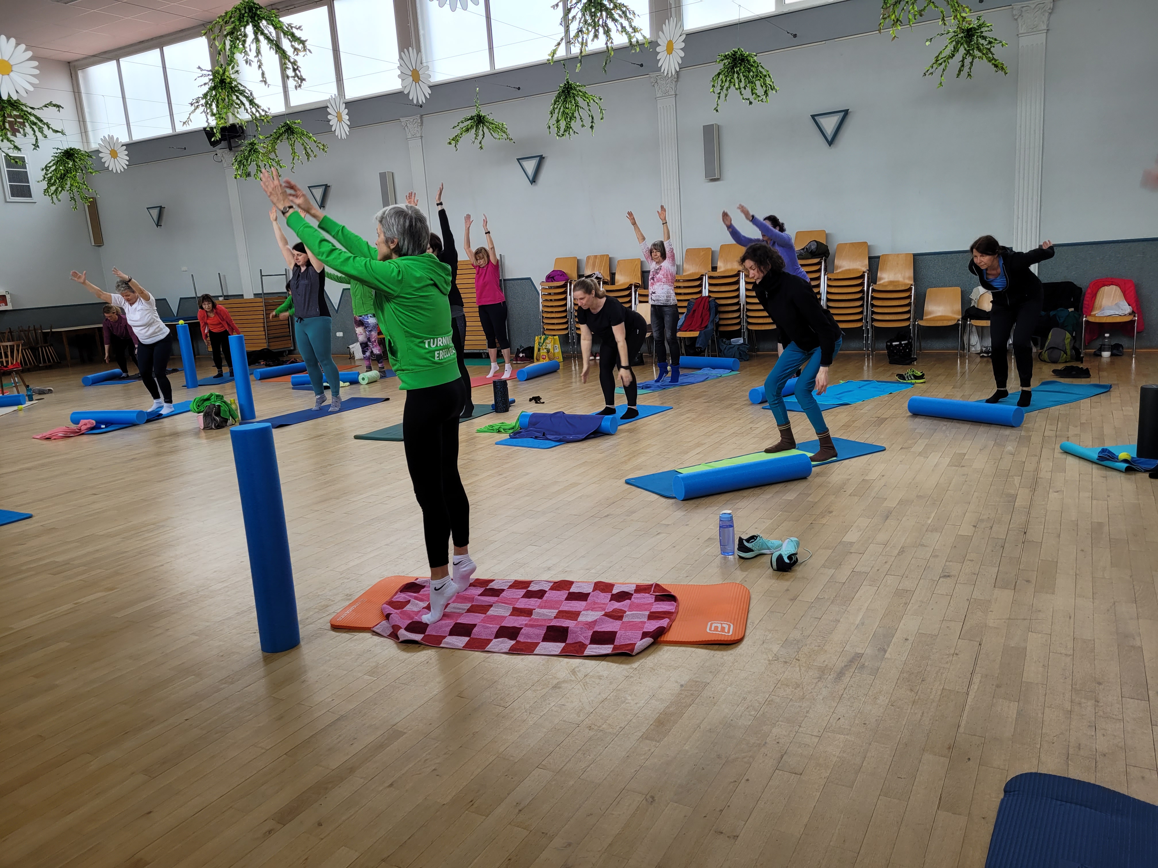Wer eine Matte oder eine eigene Rolle hat kann die gerne mitbringen ansonsten stehen welche bereit.