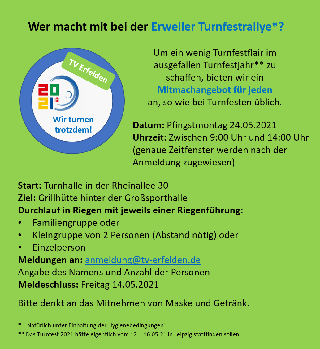 „Wir turnen trotzdem!“ hieß es vom TV Erfelden am Pfingstmontag, dem 24.05.2021. Wie im letzten Jahr fällt das deutsche Turnfest aufgrund der Corona-Pandemie ins Wasser. Da sich der TVE aber nicht die Freude am Turnen nehmen lassen will, wurde dafür die Alternative „Turnrally“ im Kleinen überlegt, die sonst im großen Stil auf dem Turnfest stattfindet. Besonders in der Natur um die TVE- Halle und die Großsporthalle Erfelden wurde an diesem Tag geturnt, geflitzt, gepuzzelt oder sogar Reifen gerollt. Möglich war dies durch das feste Hygienekonzept des Vereins, im Innenraum Abstand und Maske, ansonsten draußen möglichst kontaktlos. Entweder 1 Familie oder 2 Haushalte konnten sich gemeinsam beteiligen und wurden dabei von einem TV-Turnmitglied begleitet und angeleitet.